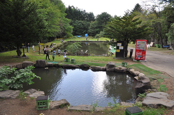 ニジマスが釣れる小池と、コイやフナが釣れる大池があり、ニジマスはBBQコーナーで食べることもできる。