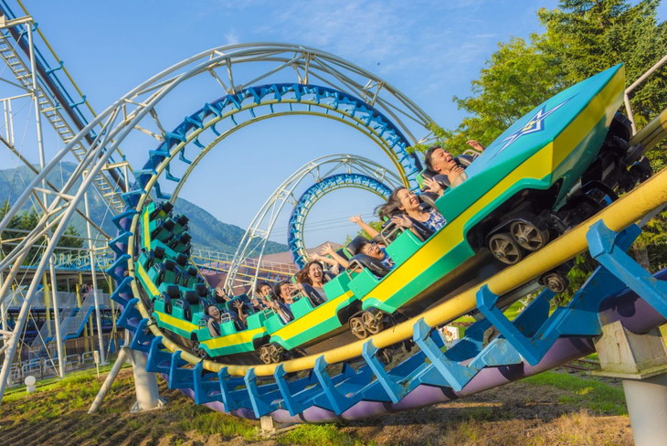 グリーンシーズンは豊かな自然の中で多種多様な遊びが体験でき、そのひとつが各種アトラクションを楽しめる北海道最大級の遊園地だ。螺旋状に連続回転する宙返りコースター「コークスクリュー」や空を駆け抜けるような宙づり絶叫コースター「ハリケーン」など、ジェットコースターだけでも数種類。