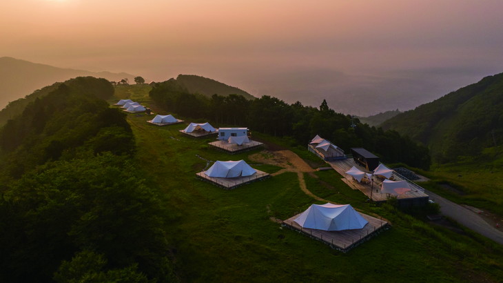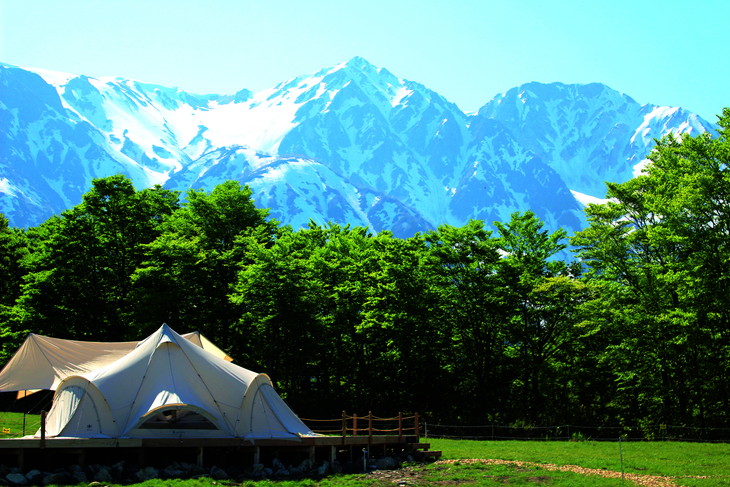 白馬八方尾根の北尾根高原は白馬三山が望めるスキー場北部に広がる高原。ここでオープンしているグラピング施設「Snow Peak FIELD SUITE HAKUBA KITAONE KOGEN」は超ゴージャスだ。