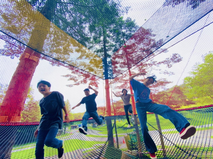 中でも、クモの巣のように張りめぐらせた巨大なネットの「ネットアドベンチャー くものす」は子供に人気のアイテム。ネットの上で元気いっぱいに遊べる空中アドベンチャーだ。