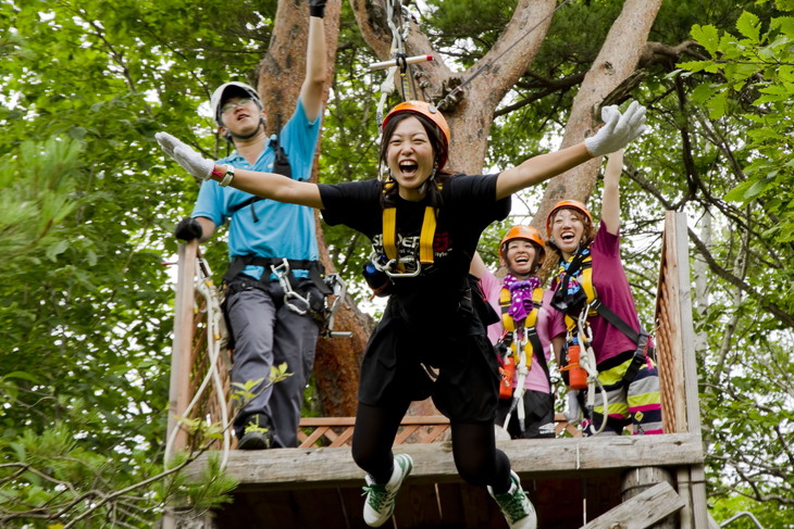 6種類のジップラインコースがあり、最長148m以上のコースも体験できる。森の中を滑空するのは鳥になったような爽快な気分だ。