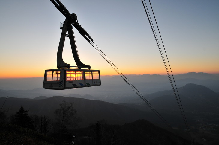 SORA terrace にアプローチするのは166人が乗れる世界最大級のロープウェイ。9:00~19:00まで営業しており、夕方には北アルプスに沈むサンセットの絶景も楽しむことができる。