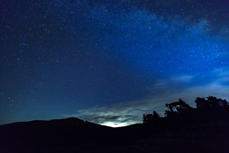 芝エリアや岩場エリア、ハンモックやチェアのあるSORA terrace など、山頂のどこでも星空観賞が可能で、晴れた日には夜空を横断する天の川が見え、運が良ければ流れ星を見ることも。