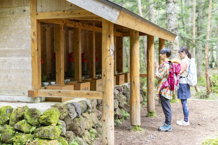 史跡には説明書きの看板も設置され、日光白根山の山岳信仰の深さを感じながら森を散策できる。