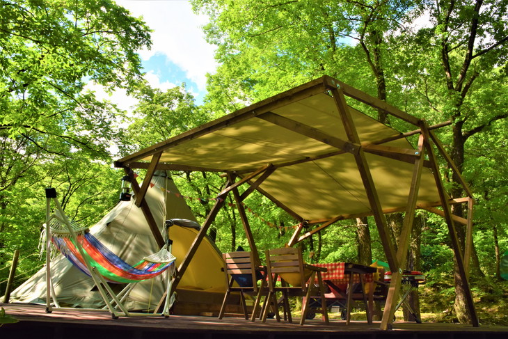 ウィンターシーズンはスキー場のコースとして利用される敷地が、グリーンシーズンはキャンプサイトやアクティビティエリアとして開放されている。バーベキューガーデンやオートキャンプなどのスペースもあるが、グランピングの場合は受付を済ませたら、テントやタープ、テーブルやチェア、グリルや食器類などの必要なものがすべて整った状態ですぐに利用できる。インストラクターが用具の扱い方を教えてくれるので、キャンプ初心者でも安心だ。