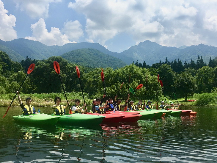 キャンプ場の近くを流れる大源太川で川遊びも楽しめるほか、キャンプ場からすぐの場所にある大源太湖ではカヤックツアーやSUP体験(要予約)もできる。