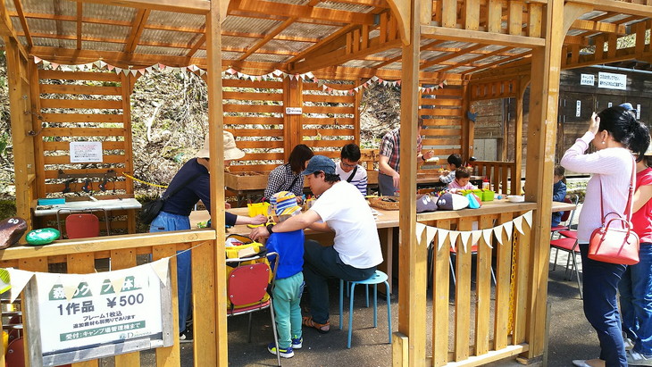 さらに、キャンプ場内にある「ネイチャークラフトハウス」では、どんぐりや松ぼっくりを使った小物の工作体験や、絵を描いてニスで仕上げるミニオカリナを作る体験ができる。