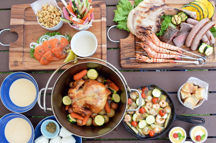 ホテルクオリティの豪華な食事。食材の準備や、器具のセッティングもインストラクターが行ってくれる。
