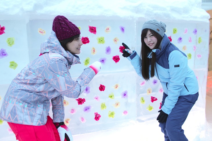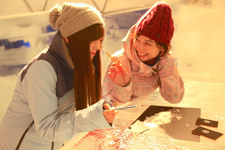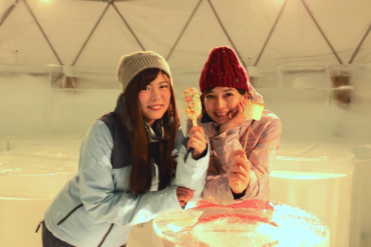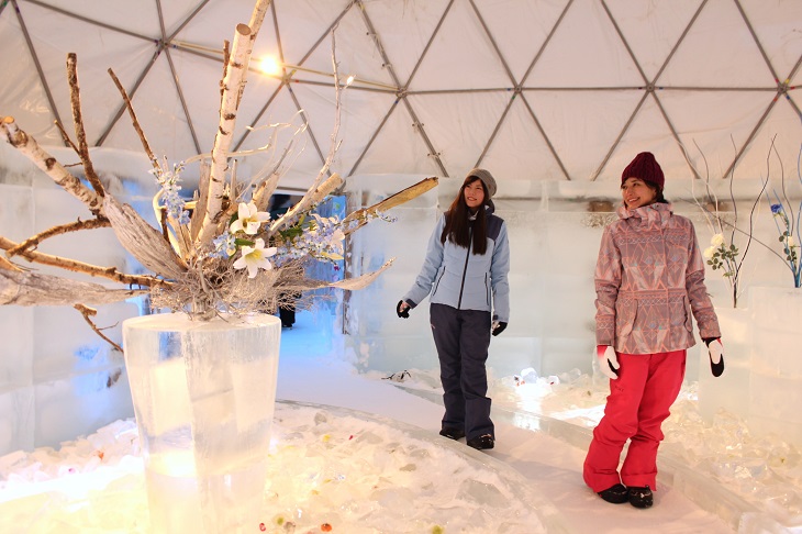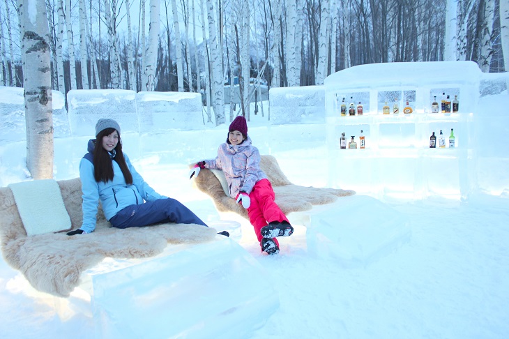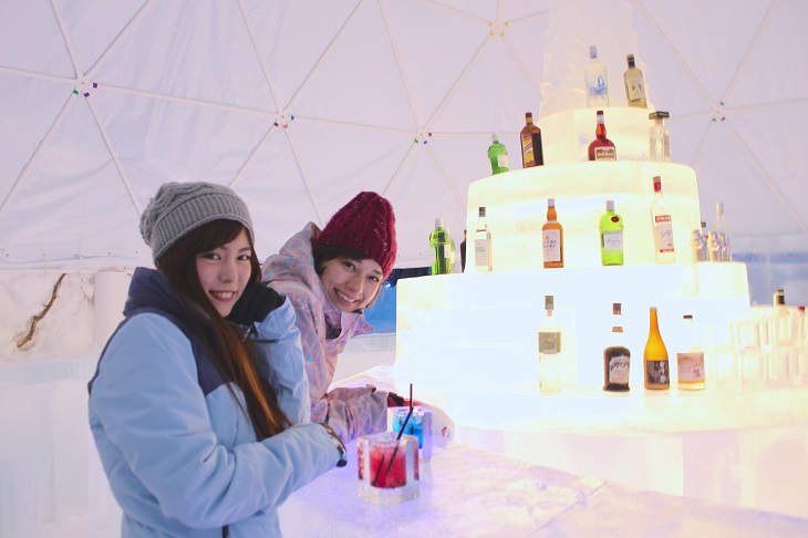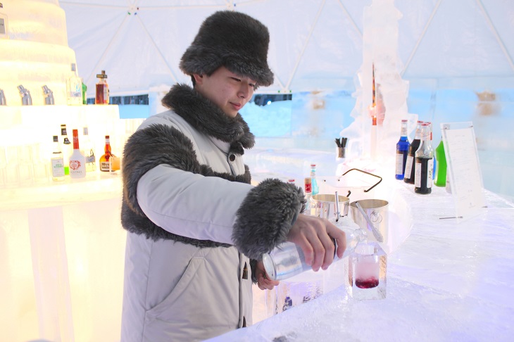 こちらはお酒好きが喜ぶ氷でできたオシャレなバー。氷の壁に囲まれた空間に氷のバーカウンターやイス、お酒を置く氷のセラーを設えます。この冬からは、飲み物のメニューをさらに充実させ、50種類以上のハードリカーやカクテルを氷のグラスで提供します。また、大雪山の万年雪の伏流水を使用した氷をカクテルに入れることも可能です。舌触りが柔らかなこの水は、延命長寿の水と言われており、日本酒「男山」の仕込み水としても使用されています。