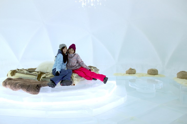 継ぎ目がないドーム状の一枚氷で作られた氷のホテルでは、他では味わうことのできない非日常的な滞在を楽しめる。氷のホテル内には、氷のベッド、イス、テーブル、氷点下30度まで耐えられるシュラフが用意されているので、睡眠時も安心。