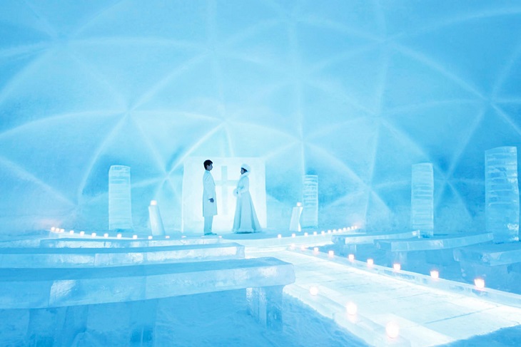祭壇や十字架、バージンロードまでが氷でできていて、真っ白で透明な世界の中はとても神聖な空気が流れ、誰もが純粋な気持ちでいられそう。