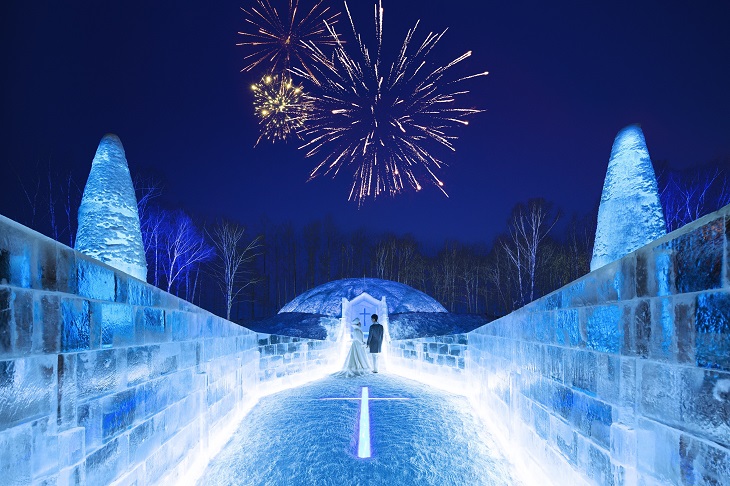 全てが氷でできた、とてもロマンチックな教会。継ぎ目のない一枚の氷にこだわり、そこには「二人の純粋な気持ちが、途切れることなく続く」という想いが込められている。
