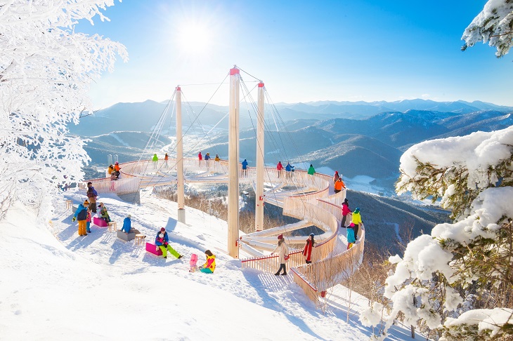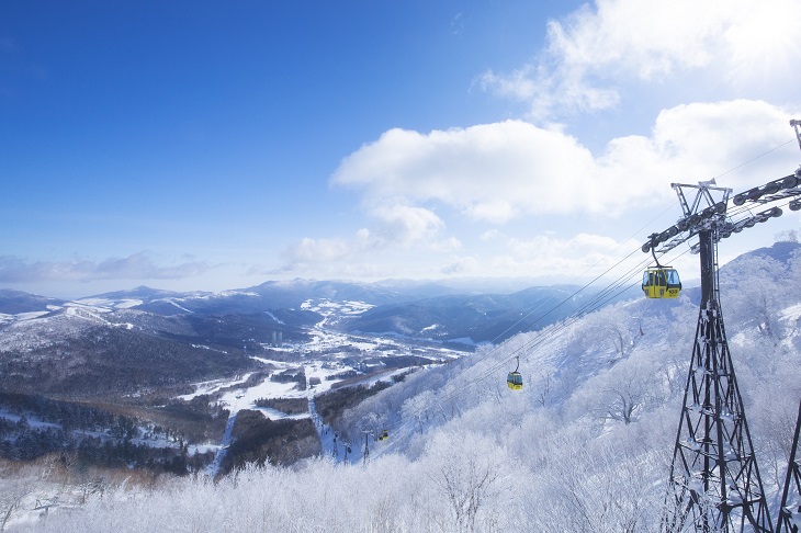 山麓のリゾートセンターから出発する雲海ゴンドラに乗り、約13分で到着する霧氷テラス。ゲレンデ内だけど、私服(スキーウエアでなく、温かい服装)でもゴンドラに乗れるのでご安心を。山麓から徐々に標高が上がっていく景色は、これまた絶景!