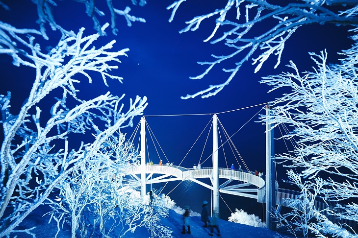 12月中に期間限定で開催される、霧氷テラスのライトアップ。スキー場営業後に開始となるので、静かな山中の霧氷テラスで幻想的な空間を楽しむことができる。辺りは静寂に包まれ、光に照らされた霧氷や、運が良ければキラキラと輝くダイヤモンドダストも!