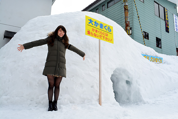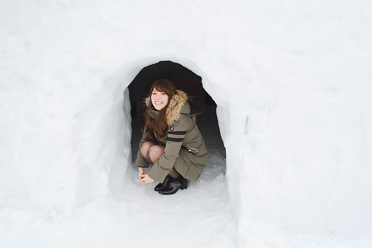 かまくらの入口は人がひとり通れるほどの小さな穴があけられています。しかし、中はとても広くなっています。