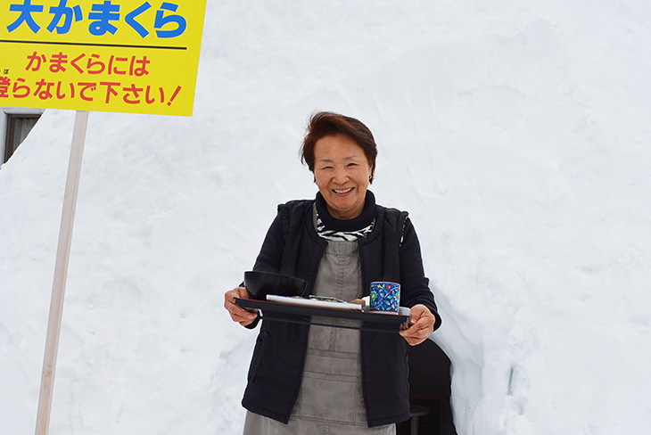 オプショナルツアーでかまくらの中で食事を楽しむことができます。食事はスキー場に併設される食堂で作った郷土料理。料理はかまくらまで運んでくれ、作りたてのあたたかな状態で味わうことができます。