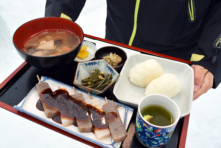 おにぎりは地元の魚沼塩沢産コシヒカリを使用。けんちん汁や味噌田楽など、あたたかな料理でひと息つけます。