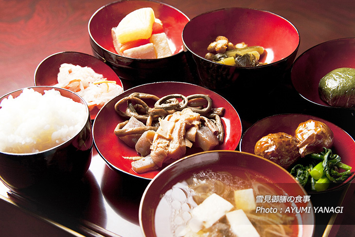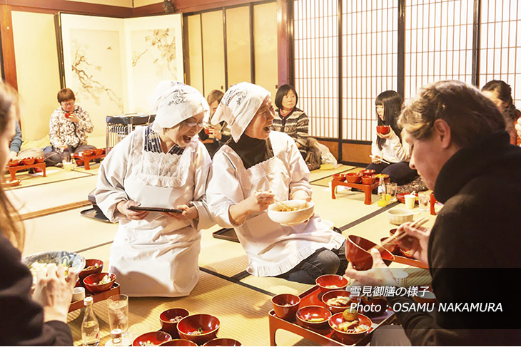 この地に暮らす人々は、冬の間、大量に降り積もる雪とともに生きる知恵や文化を育んできた。そして、この雪見御膳に出される料理は、厳しい冬の間でも栄養面だけでなく、おいしく、おなかを満足できるように考えられたもの。もちろんお米も野菜も、そして山菜などもすべて地元産の食材が使われている。集落によって出される料理の内容は少し異なるかもしれないが、地元の人たちの温かなおもてなしを受けながら、楽しく食事ができるはずだ。