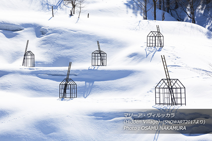 雪見御膳をおなかいっぱい食べて、心までほんわかと温まったら、次は雪と芸術に触れあうイベントへ。越後妻有では2000年から「大地の芸術祭の里」と題して、地域の豊かな自然と文化、そして現代的な芸術作品の調和を目指したイベントを開催し注目を集めている。その活動の拠点でもある『越後妻有里山現代美術館・キナーレ』には雪にちなんだオブジェなどの作品が多数展示されている。中庭では「雪あそび博覧会」(3月11日まで)が開かれていて、こたつと自転車を組み合わせたような「こたつカー・サーキット」や、プロジェクションマッピングを利用した「デジタル雪合戦」など、冬や雪に関連した体験型の作品があるのもユニークだ。年齢を問わず、楽しむことができるだろう。