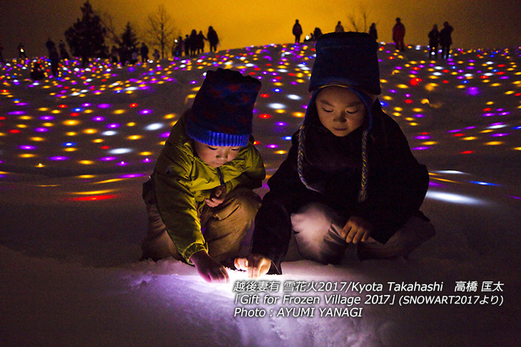 ツアー最後のイベントは「あてま高原リゾート・ベルナティオ」で開催される「越後妻有 雪花火2018」だ。このイベントは「雪と光」がテーマで、会場はアーティストの高橋匡太(たかはし・きょうた)さんの演出による『Gift for Frozen Village(ギフトフォーフローズンビレッジ)』により、通常はモノトーンの雪景色が、雪中に埋め込まれた色とりどりのLEDによって、まるで雪上に無数の花壇が現われたように、彩り鮮やかな空間となっている。ちなみにツアー参加者はLEDを1灯、雪の中に埋める体験もできる。