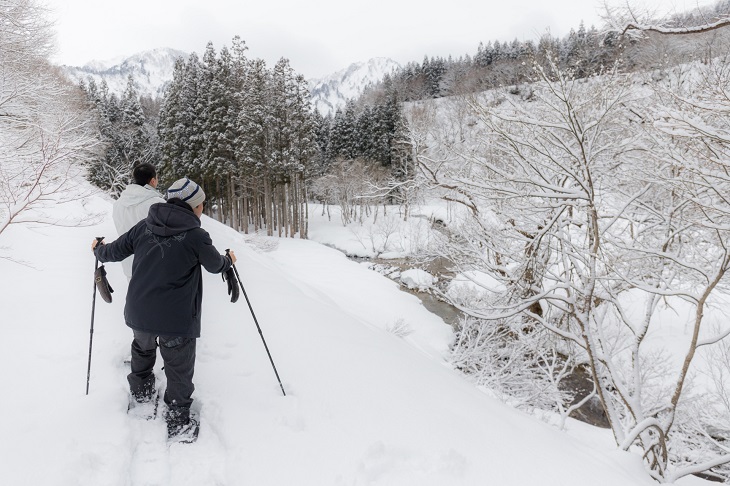 越後湯沢駅からクルマで約15分のところで、豊かな自然が残り、夏はキャンプなどで気軽に自然と親しめることから高い人気を誇る大源太エリア。冬は大量の積雪で静かで美しい白銀の世界となって、スノーシューを楽しむこともできる。このスノーシューと地元湯沢産のソバ粉を使った蕎麦打ちを、誰でも気軽に体験することができるツアーがあるので紹介しよう!