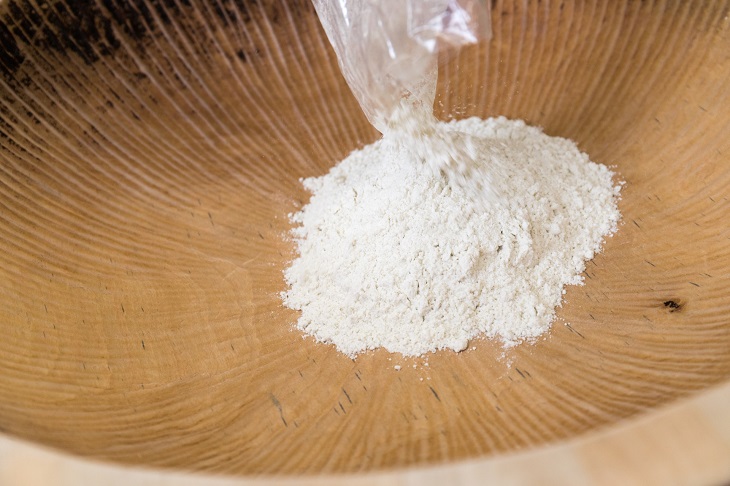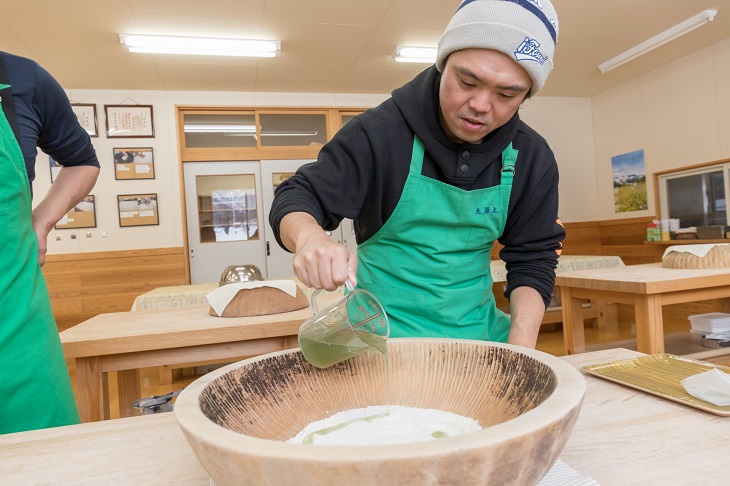 スノーシューを返却し、次はいよいよ蕎麦打ちを体験。手を洗って、用意されたエプロンを身につけて準備。用意されているのは、甘くて風味がいいと評判の湯沢産100%のソバ粉を使い、いわゆる「二八」の蕎麦にする。