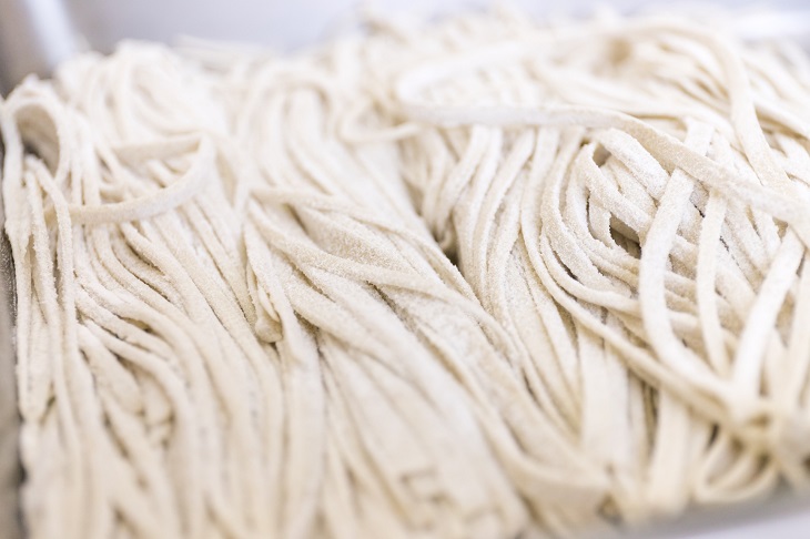 切れたソバの打ち粉を払ってトレーに並べていく。ソバの幅はちょっと差があるものの「こうやってみると、なんとなくソバらしく見える(笑)」とほっと一安心の様子。