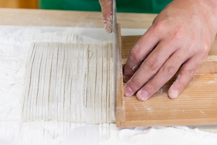 生地を乗せる切り板の上には打ち粉をたっぷりと敷しておかないと、きれいに切れない。そして駒板を上手に動かすことでソバの幅が均等になるのだが、これがとても難しい。
