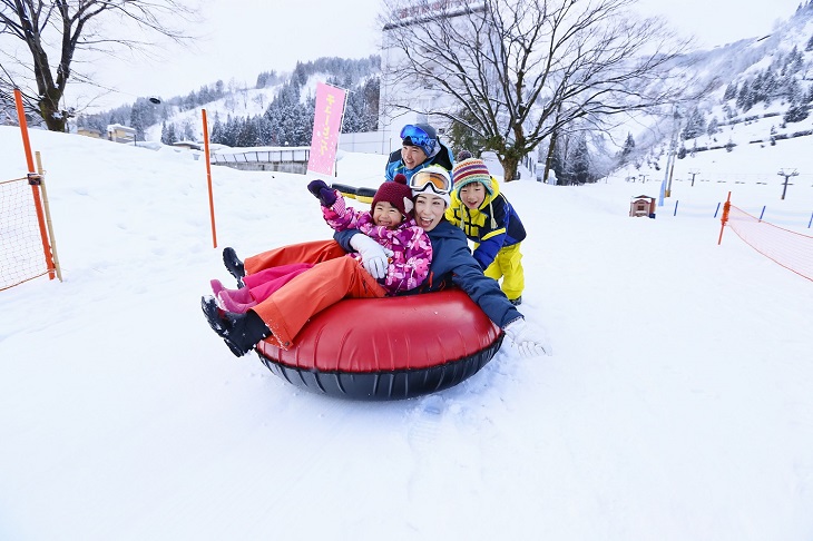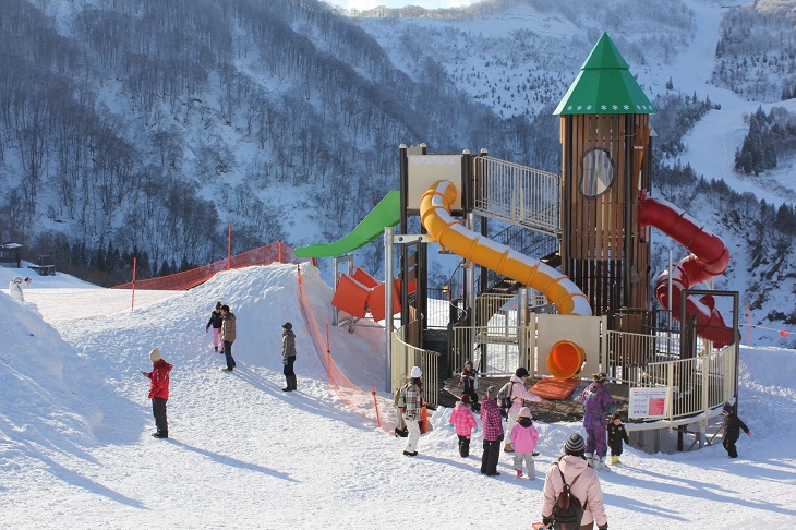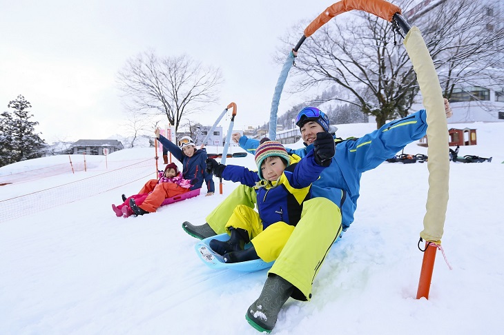 湯沢高原スキー場には、ソリや雪遊びが楽しめるスノーランドが2つあり、どちらも子供を連れたファミリーに大人気。山麓の「布場スノーランド」はスノーエスカレーターを使ってソリやスノーストライダーができるほか、滑り台のついたエア遊具もある。親子一緒に楽しく雪の遊びを体験できる。