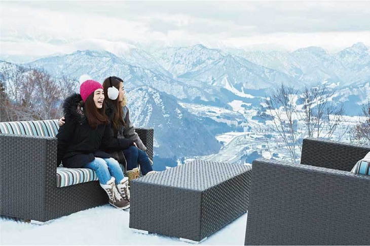 ロープウェイを降りると、標高1,000mを越える山腹に美しい銀世界が広がっている。ロープウェイ駅舎の外には、雪上にソファやテーブルが並べた眺望抜群のテラスがあり、人気スポットとして注目を集めている。テラスの眼下には雪に包まれた湯沢の町並みが広がり、谷川岳まで見渡すことができる。冬は空気が澄んでおり、遠くの山々まで一望できるパノラマビューの絶景が広がっている。
