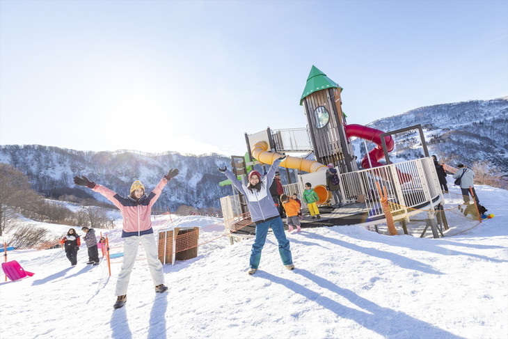 湯沢高原スキー場にはスキー場のベースと山頂駅の近くの両方にキッズパーク「スノーランド」がある。雪遊びと眺望を同時に楽しむなら、山頂駅近くの高原スノーランドへ。