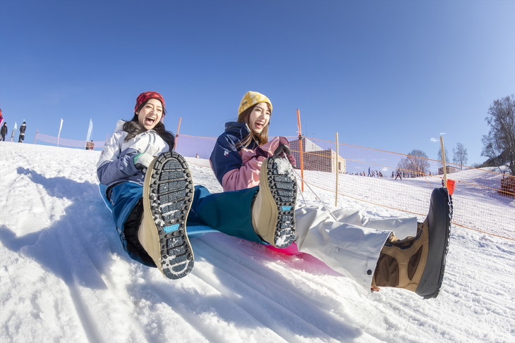 スノーランドでは安全にソリ遊びが楽しめる。子供はもちろんだが、何歳になろうとも、なぜかソリ遊びをはじめると、楽しくてやめられなくなる(笑)。