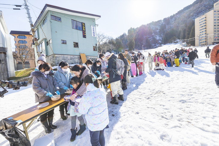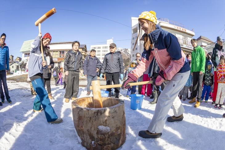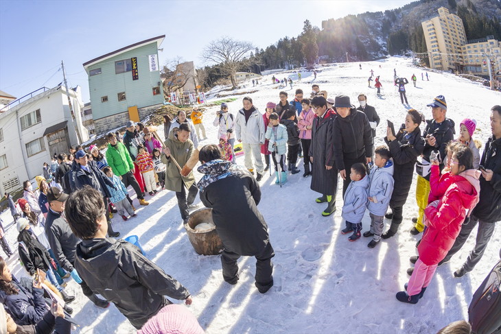 越後湯沢駅西口から徒歩5分の越後湯沢温泉・一本杉スキー場は、スキー専用ゲレンデで子供たちの歓声が響き渡るファミリーに人気のスキー場だ。一本杉スキー場ではシーズン中の主な日曜日に餅つきの体験とつきたてのお餅を無料で食べられるイベントを開催している。