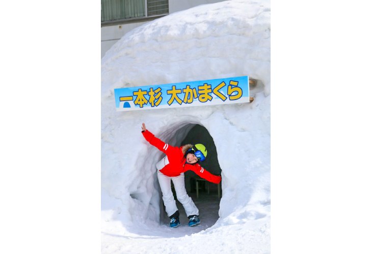 一本杉スキー場内に作られた巨大なかまくらの中で食事ができ、雪遊びを楽しむツアー(雪国体験! 「かまくら食堂」で田舎ごはんと雪遊び ※主催:(一社)越後湯沢温泉観光協会)に参加して、餅つきを体験するのもオススメだ。