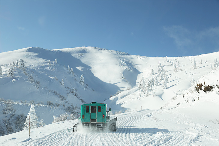 樹氷原へと進む雪上車。天気が良い日は遠く福島の山や太平洋まで見渡すことができ、吹雪の日は真っ白な景色の中を進んで行く雪上車は圧巻。地吹雪体験ツアーができる。また刈田岳に住む野生動物の足跡も見ることも。うさぎやリス、キツネやテンなどの足跡を見分けることができるか!?実際に動物を見られたら運がいい。
