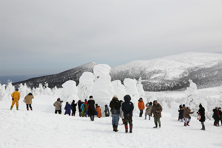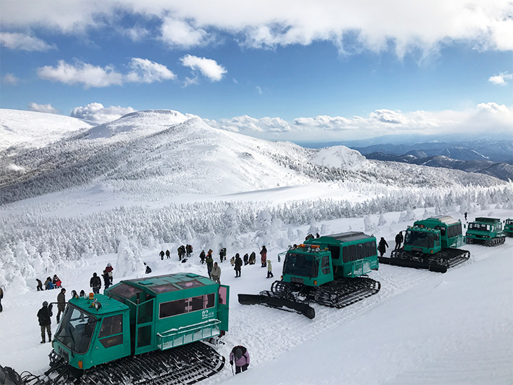 出発地点の標高は1,100m、樹氷原の標高は1,600mで標高差は500mあり、片道40〜50分かけて登って行くため、鑑賞時間を入れても往復2時間とかなり長く感じるかもしれないが、専用ガイドが乗車し軽快なトークで車内を盛り上げてくれるため退屈しない。周りに見える景色や、樹氷のでき方など良く聞いておこう。