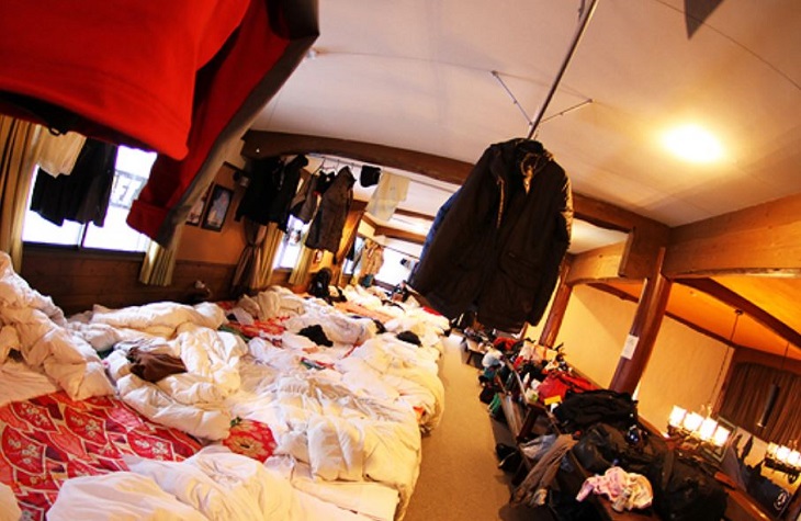かぐらスキー場の中腹に位置する、山小屋が和田小屋。予定が空いていれば、必ず1泊はしたいKAMP K2。和田小屋での宿泊は、参加者全員ザコ寝スタイル。みんな一つ屋根の下で過ごすのだ。普段なかなか体験できないスキー場のど真ん中での1泊は格別。