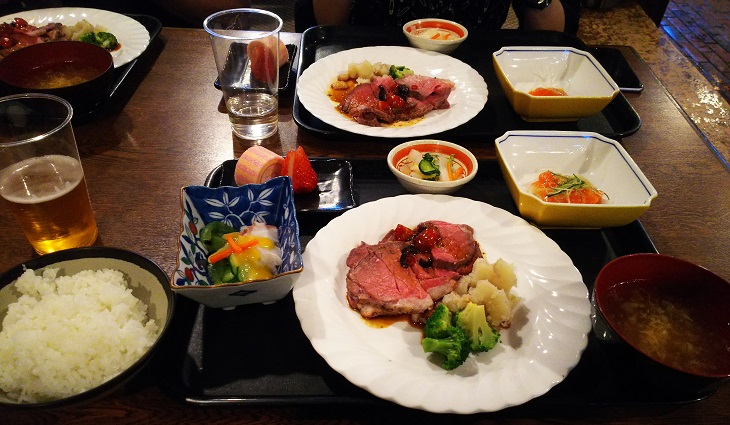 山小屋での食事とは思えない程、豪華な食事。お腹ペコペコSURF&SNOWスタッフはぺろりと完食。疲れを癒す冷たい生ビールと、新潟の銘酒「鶴齢」も振る舞われ、皆が会話を楽しんだ。