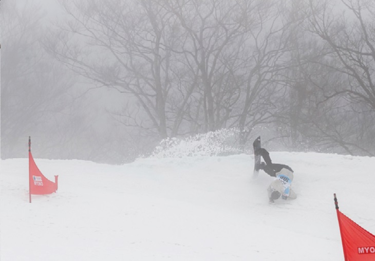 前日の公式練習が強風によるゴンドラ運休で中止になったため、ライダー達は当日わずかな時間でコースチェックを行なったのみでのぶっつけ本番となった。 滑走本数は2本のベストタイムを採用。当日、風はおさまったものの天候は曇り空、時折雪が舞い、4月とは思えないほど冷え込んだ。それに加え、スタートから最初の旗門がやっと見えるほどの濃霧に覆われる始末。最悪の状況……とは、意外にもならなかった。霧が濃いのは前半だけ。後半のスピードゾーンにはほぼ霧はかかっておらず、クリアな視界が確保された。前半の濃霧に関してもさすがは名だたるライダー達、次の旗門が見えさえすれば問題はないとのことだった。 そして寒さもいい方向へ働いた。春にすべったことがある人にはわかると思うが、春の雪は気温が上がるとソールがペタペタと張り付くようなストップスノーになってしまう。