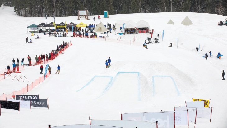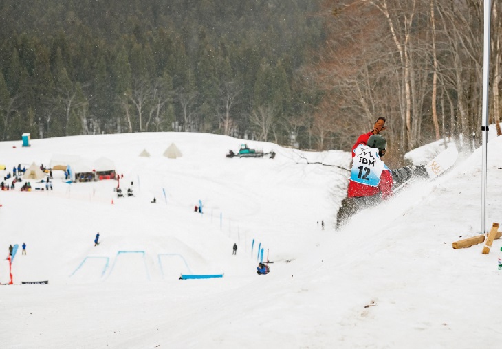 フリーライディングコースにはフラットバーンの他、両脇に長く続くバンク、上部と下部に作られた起伏、ジャッジテントの目の前にヒップとしても使えるバンクなどが作られ、無数のラインが想像できるコースが用意された。ライダーたちはこのコースを文字どおりフリーにライディングし、基礎的なすべりから応用的なトリックまで、発想力とスキルを武器にスタイリッシュにすべり降りていく。そしてフリーライディングコースが終わると、そのままストレートジャンプ用に作られたキッカーへのアプローチが始まる。フリーライディングとストレートジャンプは別々にジャッジされるが、ライダー達は両種目を一連ですべり降りる。この競技システムもSBM ならではの面白さのひとつだ。