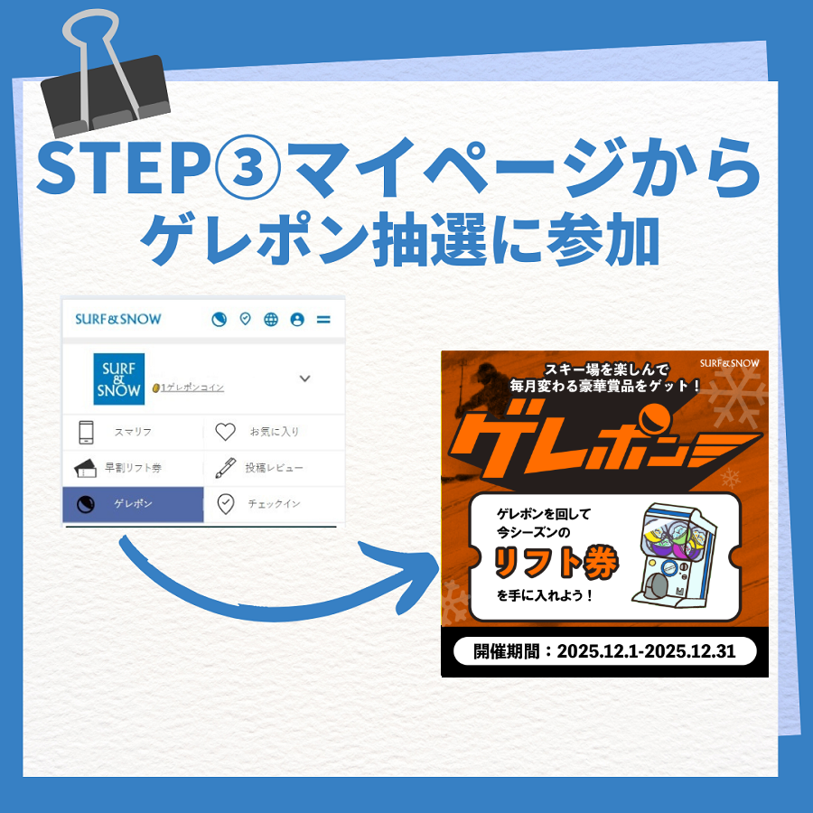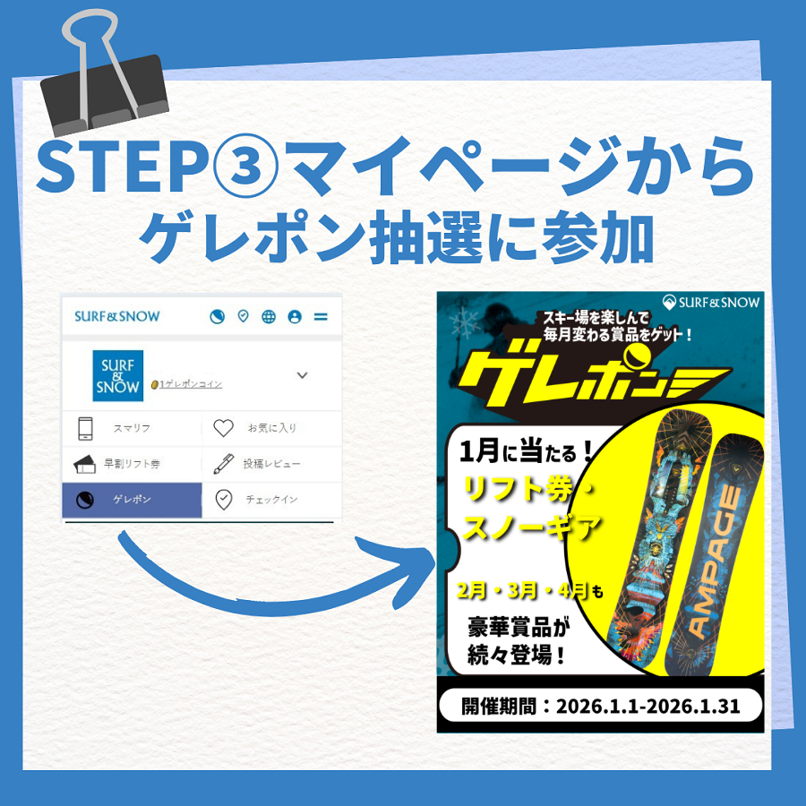 スキー場に遊びに行ってゲレポンコインを貯めたら、ぜひゲレポンに参加してくださいね。