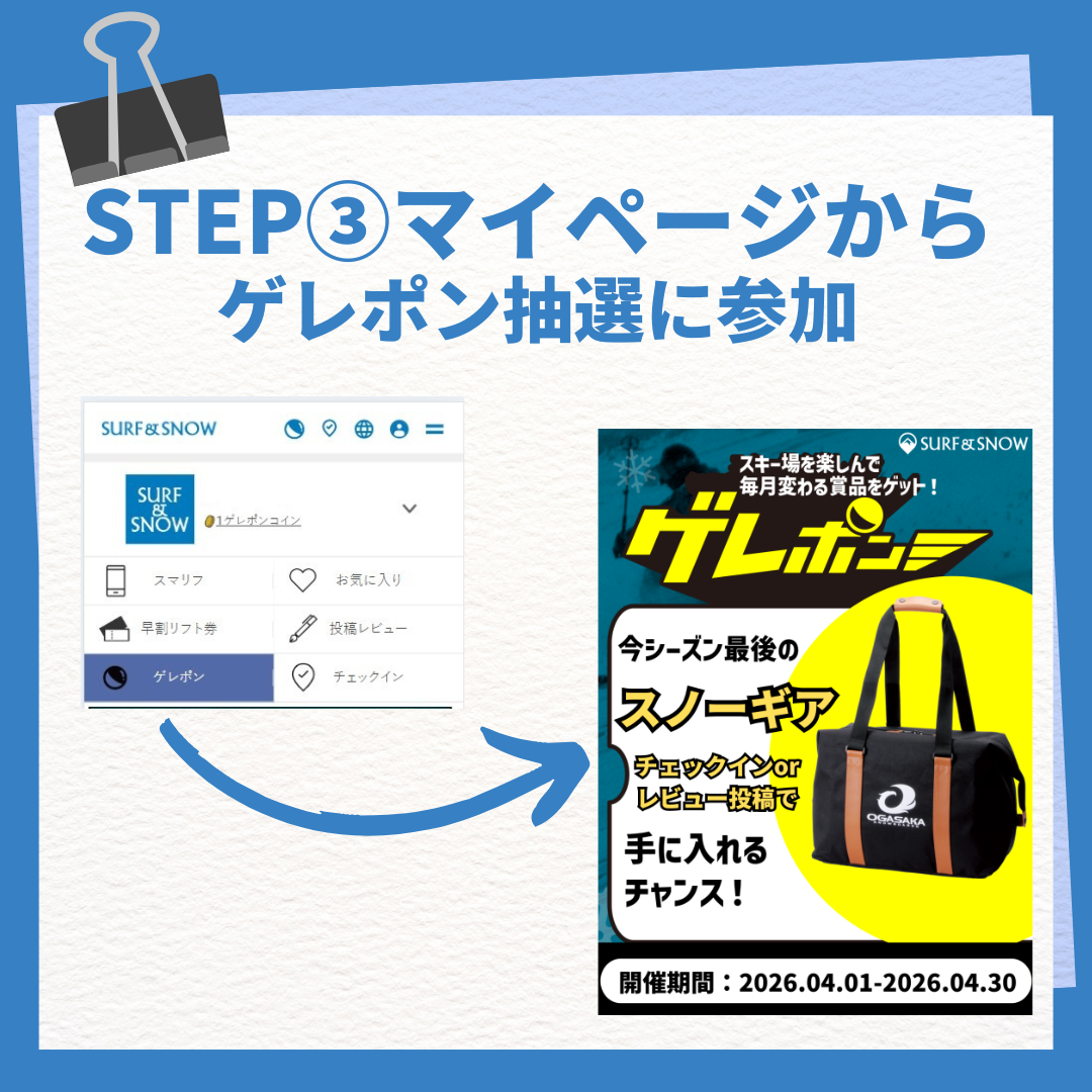 スキー場に遊びに行ってゲレポンコインを貯めたら、ぜひゲレポンに参加してくださいね。