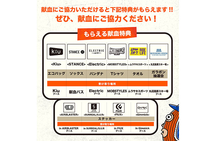 SNOWBANKの活動は、賛同・協力いただける「雪主」と呼ばれる個人及び企業、団体様からの寄付で成り立っている。1口2,000円からで寄付が可能だが、この献血の特典だけでも十分すぎる内容だ。