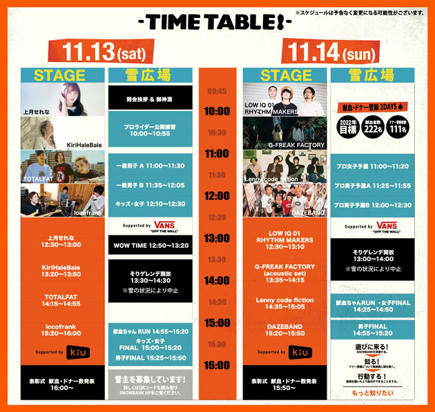 2日間にわたり、豪華アーティストによるライブ、トップスノーボーダーたちが熱いバトルを繰り広げるスノーボードコンテスト、数多くの出展ブースで体験できるワークショップや、お買い得なグッズ販売など、盛りだくさんの内容になっている。これだけの内容で、入場は無料!