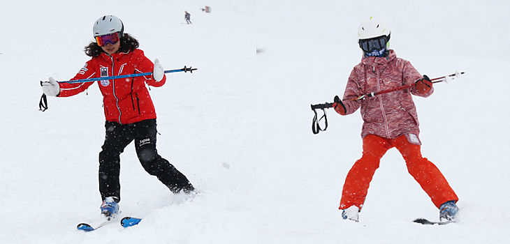 皆さんに共通していたのは、ポジションが後ろだということでした。スキーを履いて滑った時にちょうどブーツの真上に乗っている状態がベースとなるのが理想なのですが、ほとんどの人がブーツの後ろにややよりかかったようなポジションになっていました。これだとスキーのトップからテールまでをしっかり使って操作することができません。上級テクニックとして、ターンの後半にテール寄りに乗ってスキーを加速させるような動きもあるんですが、それもまずは基本ポジションができていての話なので。それから、上体の向きや角度がターンのたびに内側に傾いてしまう人も多かったですね。小回りでは、脚部のひねりを使って上体を谷側に向けながら、外スキーに乗っていく必要があります。