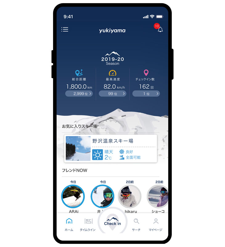 まずはyukiyamaというアプリをご存知ない方に少し説明しておこう。何と言っても最大の特徴は、全国約400のスキー場のデジタルマップをアプリひとつで確認できることにある。スキー場に到着してユーザーがゲレンデに「チェックイン」すれば、GPSを利用して現在どこを滑っているかを瞬時に把握でき、さらに滑走距離や最高速度なども記録できてしまう。また、一緒に雪山に訪れた仲間をフレンド登録しておけば、その仲間がどこを滑っているかもリアルタイムでわかる。そのほかにも、お得なクーポンが発行されたり、オンラインイベントへ参加、SNSへのデータ出力といった様々な機能が盛りだくさんのアプリなのだ。まさに雪山をさらに面白くするための次世代ツールと言っても過言ではないだろう。