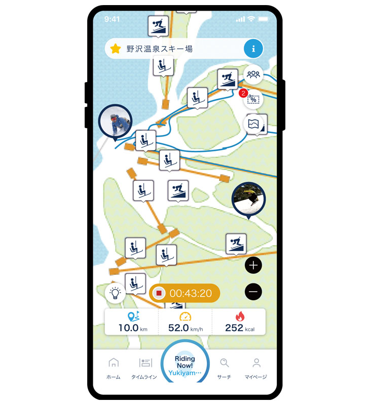 では、大型アップデートで何が変わったのだろうか。岡本によると、「スキー場のマップがリアルタイムで見られるなど、基本的なコンセプトや使い方は今までと大きく変わっていません。ただ、ユーザーの使い心地は大幅に変わったと思います。アプリを起ち上げたら以前はタイムラインが表示されてましたが、現在ではトップにホーム画面があって、そこで自分のデータや友達の動向、スキー場検索やイベント情報などを確認できます。細かなことを言い始めるとキリはないですが、とにかくスキー場に行って、このアプリを活用して遊んでもらうという根幹部分は以前と同じです」とのことだ。