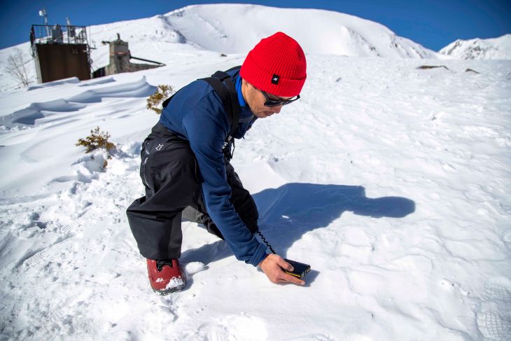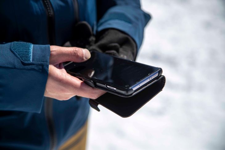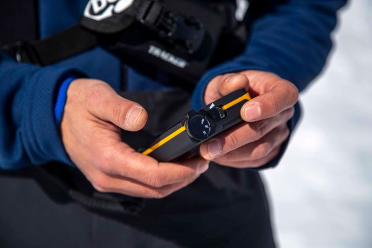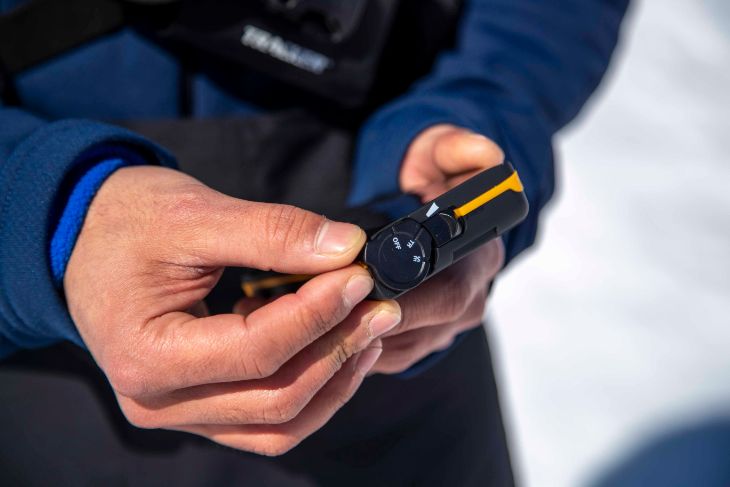 歩き出す前に必ずビーコンのスイッチをオンに。きちんと電波を受信しているか、ガイドさんに確認してもらおう。携帯電話やスマートフォンが、万一の際にビーコン捜索を邪魔してしまうことがある。ビーコン使用時は、電源を切ることが望ましいが、電源を入れておく場合はビーコンから30センチ以上離れたポケットに入れるようにしよう。