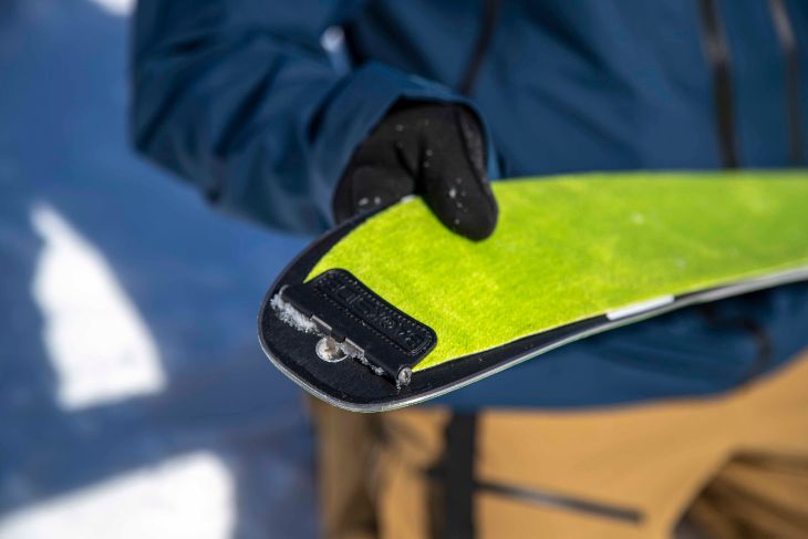 ツアービンディングはシールとセットで使う。バックカントリーなら、歩く斜度や使い方に合わせて長さ調節ができる、伸縮式のポールも使いやすい。斜度があるときはクライミングサポートを利用。カカト下にある器具を使うことで、ビンディングだけを水平にすることができ、ハイクアップ中の足首への負担を減らしてくれる。