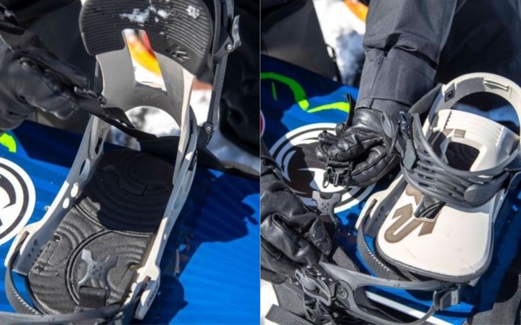 メーカーやシリーズによって装着方法は様々だが、今回使用したTUBBS FLEX ALPは、左の写真中央部分のオレンジのバーを引いて解放して、真ん中に足を乗せる。次に甲の両サイドにあるベルトを両サイドに引けば前側全体が締まる。